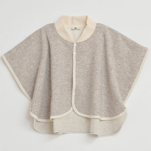 ボタンが前に3個、両脇に1個づつ付いたポンチョ型のウォーマーは、さっと羽織るだけで肩口を冷やしません。